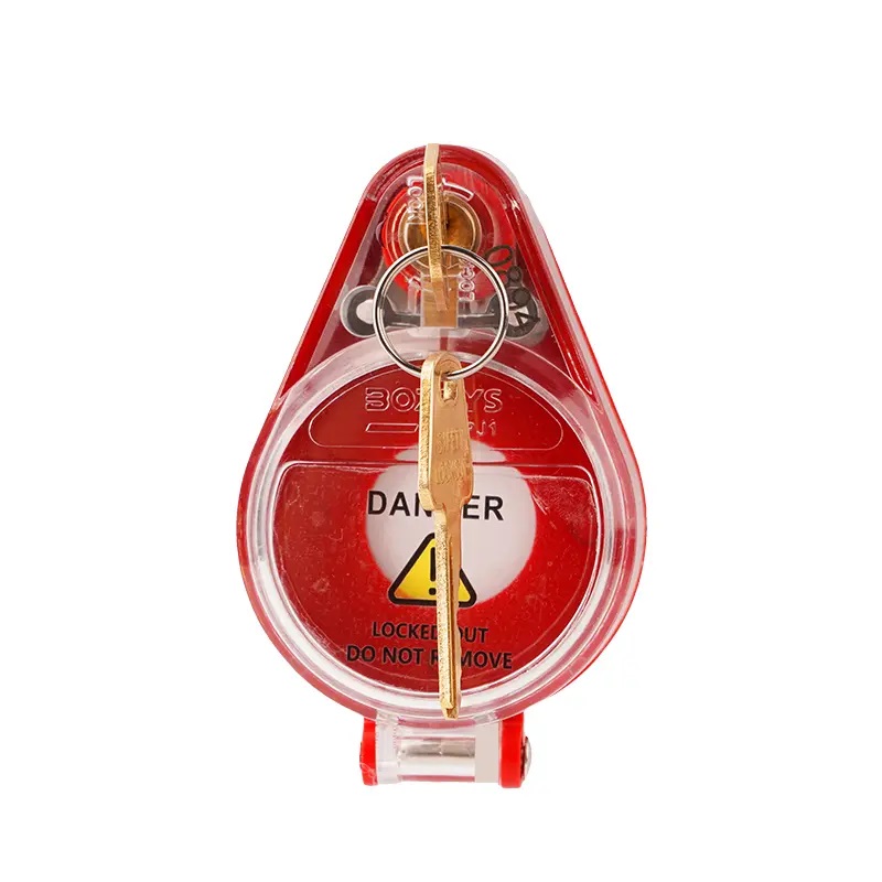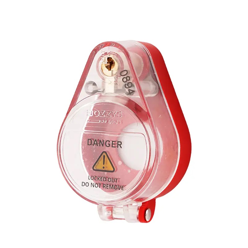 Блокиратор пусковой кнопки со встроенным замком DPJ1. Ключ и тело блокиратора имеют одинаковый уникальный номер для простой и быстрой идентификации.