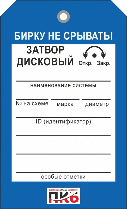 Информационная бирка "Затвор дисковый". Изготовлена из пластика ПВХ, толщиной 0,3 мм, без ламинации, диаметр отверстия 7 мм. По желанию заказчика толщина бирки может быть увеличена до 1-2 мм. Нанесение текста необходимо производить маркером или шариковой ручкой. Размер 70 х 115 х 0,3 мм.